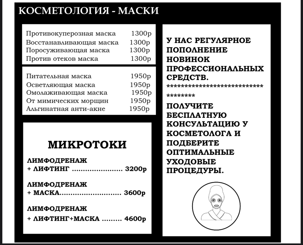 | Уход (лицо и зона декольте): антивозрастной, противокуперозный, восстанавливающий, омолаживающий, лимфодренажный, осветляющий анстресс и т.д.) |